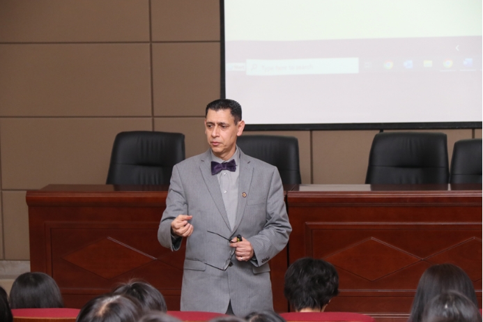 Firstly, Dean Cao Ruonan welcomed Professor Ray Taheri and briefly introduced his academic background and remarkable achievements. Then, Professor Taheri passionately and clearly analyzed the profound changes occurring in global higher education and the new challenges and requirements they pose to educators, especially foreign language teachers in universities, using vivid image displays, data analysis, and interactive Q&A sessions.