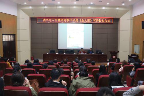2017年10月11日下午,陕西省作家协会副主席、西安市作家协会主席吴克敬先生的作品集《血太阳》英译授权仪式在我院第二课堂报告厅举行。我院胡宗锋教授和英籍外教Robin博士将作为主要译者完成翻译任务。授权仪式之后,吴克敬为我院师生做了题为“读书与人生”的精彩讲座。这是我院校庆活动系列讲座中的第二场讲座。