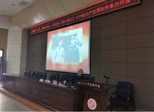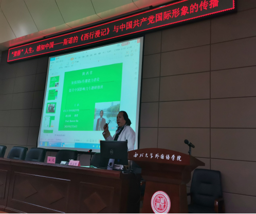 参观完展览之后,研修班学员在第二课堂报告厅,聆听了由斯诺研究专家安危先生和我院院长、陕西省斯诺研究中心主任胡宗锋教授的两场讲座。讲座围绕斯诺夫妇的“架桥”人生和他们的著作,讲述斯诺夫妇的《西行漫记》和《续西行漫记》与中国共产党国际形象传播这一讲好中国故事的经典成功案例。胡宗锋院长在讲述斯诺传播中国故事的案例之外,还结合他出版的中美文化沟通著作《龙与鹰》和《西方老人与年轻的中国姑娘》为例,探讨如何让外国人真正感知中国文化的有效途径。