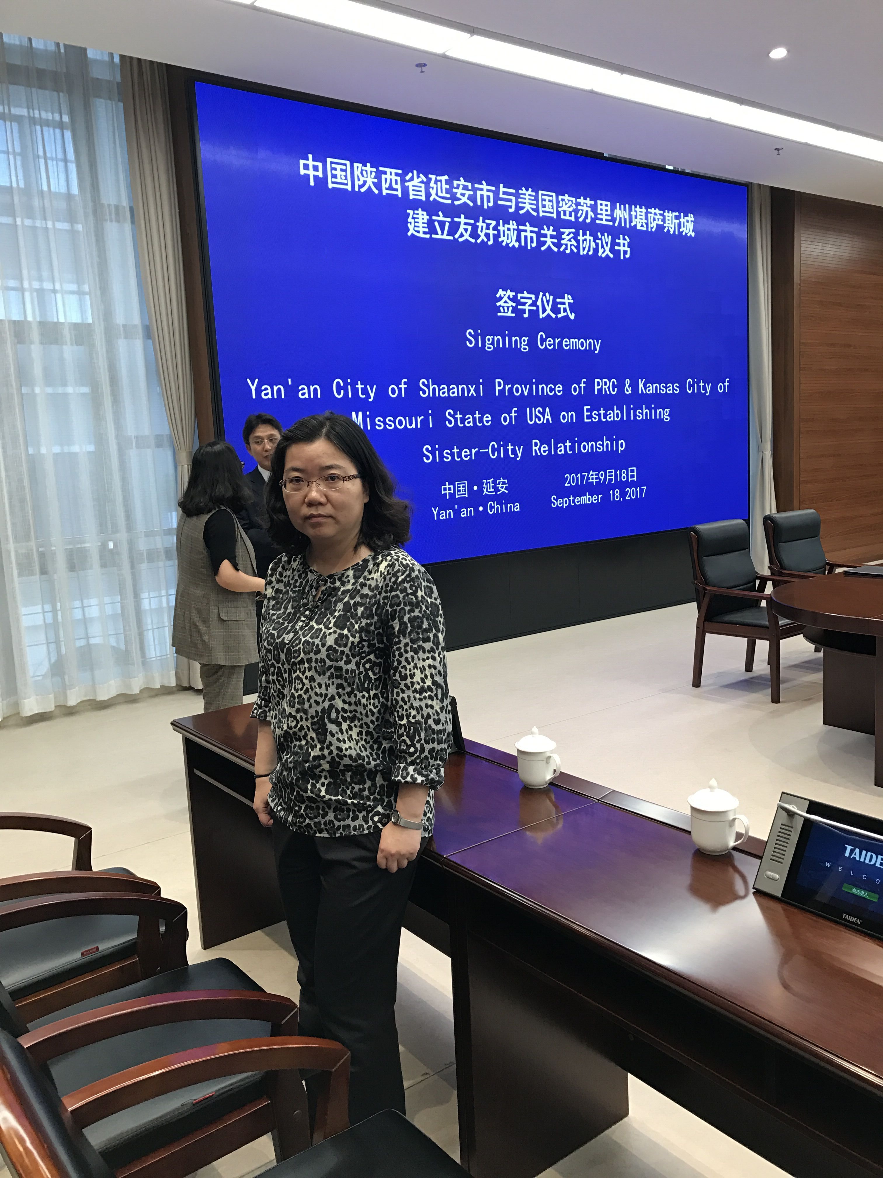 我院斯诺研究中心副秘书长袁西玲老师受到延安市人民政府的邀请,出席了 2017年9 月18日在延安举行的延安市与美国堪萨斯市友城缔结签字仪式。